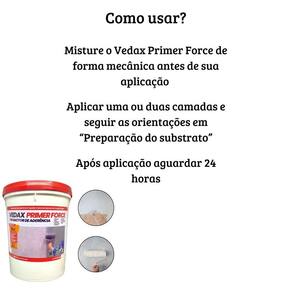 Promotor aderência vedax primer force 1kg tinta piso azulejo Vedax primer force - promotor de aderência e endurecedor de superfícies Alta resistência, aderência superior e versatilidade em um único produto. Vedax primer force é um promotor de aderência monocomponente que forma uma camada de alta resistência após a aplicação. Seu acabamento áspero favorece a aderência química e mecânica, sendo ideal para diversos substratos - desde superfícies lisas como porcelanatos e vidros, até bases porosas como concretos e rebocos deteriorados. Além disso, atua como endurecedor de superfícies, aumentando a resistência à abrasão e reduzindo o desgaste em pisos envelhecidos ou esfarelando. Principais vantagens: Cria ponte de aderência em substratos lisos e porosos Substitui o selador comum com desempenho superior Aceita assentamento direto de pisos cerâmicos e porcelanatos Melhora a coesão e resistência de rebocos e concretos Resistente à água estagnada Flexível: absorve pequenas fissuras em paredes externas Pode ser como primer para texturas e impermeabilizações Produto ecológico: sem solventes e com baixo voc Campos de aplicação: Concreto, reboco, argamassa e massa de regularização Pisos lisos: porcelanato, cerâmica, vidro Superfícies metálicas com preparo adequado Madeira e eps Chapisco rolado com agregado antes de gesso ou acabamento Paredes novas ou repinturas Lajes, terraços, coberturas, marquises e beirais Pisos deteriorados ou com baixa resistência soltando pó Modo de uso: Preparação da superfície: Deve estar seca, limpa, sem poeira, graxa, óleo ou nata de cimento. Trincas devem ser tratadas previamente com vedax sela trinca. Preparo do produto: Homogeneizar o produto com furadeira e hélice apropriada. Primeira demão: diluir com até 20% de água limpa Demais demãos: aplicar puro Ferramentas: rolo, trincha ou vassoura de cerdas macias Intervalo entre demãos: 2 a 3 horas Consumo médio: Substratos porosos: 300 a 500 g/m com diluição Substratos lisos: 150 a 300 g/m com diluição Superfícies metálicas: 150 a 300 g/m sem diluição Tempo de cura: 6 horas em reboco, concreto ou alvenaria 24 horas em pisos lisos como porcelanato e vidro Para assentamento de pisos: aguardar 72 horas após a última camada Indicado uso de argamassa tipo ac-iii e realização de juntas de dilatação Após o uso, lavar as ferramentas com água imediatamente. Produto seco só é removido mecanicamente. Restrições de uso: Não aplicar sobre superfícies úmidas ou sujeitas à umidade ascendente ou pressão negativa Embalagens disponíveis: 1 kg, 5 kg e 20 kg Validade: 24 meses armazenado fechado, em local seco e ventilado Composição: Água, resina elastomérica, cargas minerais e aditivos especiais Normas técnicas atendidas: Abnt nbr 13245 - execução de pinturas em edificações Abnt nbr 9575 - seleção e projeto de impermeabilização Vedax primer force: preparação inteligente, aderência reforçada, proteção duradoura. Ideal para quem exige resultados profissionais com segurança e praticidade.