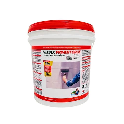 Promotor aderência vedax primer force 5kg tinta piso azulejo Vedax primer force - ponte de aderência de alto desempenho Transforme qualquer superfície em uma base segura, resistente e com excelente aderência Vedax primer force é um promotor de aderência monocomponente que cria uma camada firme, com acabamento áspero, ideal para aumentar a adesão química e mecânica em uma ampla variedade de substratos. Também atua como endurecedor de superfície, recuperando pisos e rebocos deteriorados, aumentando sua resistência à abrasão. Principais aplicações: Paredes em reboco novo ou repintura Lajes, coberturas, marquises, beirais Pisos cerâmicos, porcelanatos, madeira, vidro e metal com preparo adequado Chapisco rolado sobre alvenaria, concreto, eps, etc. Pisos e rebocos desgastados ou soltando pó Como primer para impermeabilização ou aplicação de texturas Vantagens do vedax primer force: Aceita assentamento direto de pisos Cria ponte de aderência em superfícies lisas ou porosas Substitui o selador comum com mais desempenho Melhora a resistência e coesão da superfície Produto ecológico, sem solventes e com baixo voc Pode ser em áreas internas e externas Absorve fissuras de retração e aceita estagnação de água Rendimento aproximado: Substratos porosos: 300g a 500g por m diluído de 10 a 20% Substratos lisos: 150g a 300g por m diluído de 10 a 20% Metais: 150g a 300g por m sem diluição Como usar: Limpe a superfície, removendo poeira, graxa, óleo ou tinta solta Dilua a primeira demão em até 20% de água limpa Aplique com rolo, trincha ou vassoura de cerdas suaves A segunda demão deve ser feita sem diluição Aguarde o tempo de cura antes de seguir com a próxima etapa: 6 horas para rebocos e concretos 24 horas para pisos lisos como cerâmica e vidro 72 horas para assentamento de pisos sobre a base tratada Importante: Não aplique em superfícies úmidas ou com umidade ascendente Não usar em locais com pressão negativa de água Ferramentas devem ser lavadas com água logo após a aplicação Apresentação: Embalagens de 1kg, 5kg ou 20kg Composição: Resina elastomérica, água, cargas minerais e aditivos especiais Marca: Não Informado Ean: 7897523157303