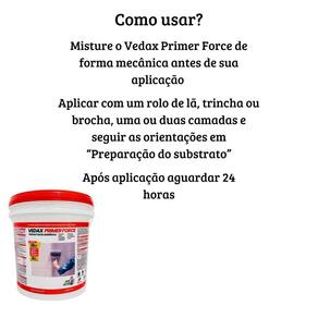 Promotor aderência vedax primer force 5kg tinta piso azulejo Vedax primer force - ponte de aderência de alto desempenho Transforme qualquer superfície em uma base segura, resistente e com excelente aderência Vedax primer force é um promotor de aderência monocomponente que cria uma camada firme, com acabamento áspero, ideal para aumentar a adesão química e mecânica em uma ampla variedade de substratos. Também atua como endurecedor de superfície, recuperando pisos e rebocos deteriorados, aumentando sua resistência à abrasão. Principais aplicações: Paredes em reboco novo ou repintura Lajes, coberturas, marquises, beirais Pisos cerâmicos, porcelanatos, madeira, vidro e metal com preparo adequado Chapisco rolado sobre alvenaria, concreto, eps, etc. Pisos e rebocos desgastados ou soltando pó Como primer para impermeabilização ou aplicação de texturas Vantagens do vedax primer force: Aceita assentamento direto de pisos Cria ponte de aderência em superfícies lisas ou porosas Substitui o selador comum com mais desempenho Melhora a resistência e coesão da superfície Produto ecológico, sem solventes e com baixo voc Pode ser em áreas internas e externas Absorve fissuras de retração e aceita estagnação de água Rendimento aproximado: Substratos porosos: 300g a 500g por m diluído de 10 a 20% Substratos lisos: 150g a 300g por m diluído de 10 a 20% Metais: 150g a 300g por m sem diluição Como usar: Limpe a superfície, removendo poeira, graxa, óleo ou tinta solta Dilua a primeira demão em até 20% de água limpa Aplique com rolo, trincha ou vassoura de cerdas suaves A segunda demão deve ser feita sem diluição Aguarde o tempo de cura antes de seguir com a próxima etapa: 6 horas para rebocos e concretos 24 horas para pisos lisos como cerâmica e vidro 72 horas para assentamento de pisos sobre a base tratada Importante: Não aplique em superfícies úmidas ou com umidade ascendente Não usar em locais com pressão negativa de água Ferramentas devem ser lavadas com água logo após a aplicação Apresentação: Embalagens de 1kg, 5kg ou 20kg Composição: Resina elastomérica, água, cargas minerais e aditivos especiais