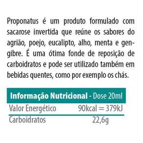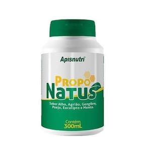 Propo Natus 300Ml Propo natus é uma fonte de carboidrato, a base de sacarose invertida sabores agrião, poejo, gengibre, eucalipto, alho e menta. A mistura dos extratos de agrião e eucalipto ao com altos teores de própolis, potencializa a ação preventiva e curativa da própolis e é recomendado como potente nas tosses com catarro e em bronquites. O com própolis, agrião e eucalipto é um excelente e combate com eficácia a tosse, pois une o agrião, há muito tempo utilizado na alimentação e tradicionalmente reconhecido pela sua ação fluidificante das vias respiratórias, o eucalipto que age como anti-séptico das vias respiratórias e a própolis, um antibiótico natural. A presença do proporciona um sabor agradável e beneficia o organismo com suas propriedades. Instruções de Uso Modo de Preparo Ingerir 10mL 1 colher de sopa 2 vezes ao dia. Produto enviado com Validade Apta para o Consumo. Importante Saber Diabéticos: contém açúcar. O Ministério da Saúde adverte: Não existem evidências científicas comprovadas de que este alimento previna, trate ou cure doenças. Pessoas que apresentem doenças ou alterações fisiológicas, mulheres grávidas ou amamentando nutrizes deverão consultar o médico antes de usar o produto. Isento de registro M.S. Conforme RDC 27/2010