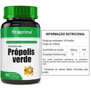 Extrato de própolis verde em pó, excipiente amido de milho e antiumectante dióxido de silício. Composição da cápsula: gelatina, água e umectante glicerina.