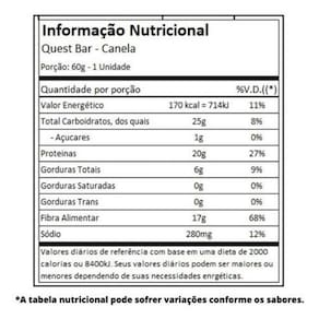 A Quest Nutrition é uma marca que já é uma referência internacional no mundo da suplementação esportiva, e agora finalmente seus produtos estão chegando ao Brasil, hoje trouxemos um sucesso mundial de vendas, estamos falando da barra de proteína Quest Bar que além de serem super proteicas também tem um excelente sabor. A Quest Bar possui 20g de proteína por unidade além de fibrasquew auxiliam na saúde gastrointestinal, ou seja, após sua ingestão você não sentirá desconforto na hora da absorção pelo organismo, fora isso ela possuive um baixíssimo teor de gordura. Os especialistas das Quest Nutrition formularam a Quest Bar com whey protein, adoçado com sucralose e saborizantes naturais, além disso, ela é livre de glúten e sem adição de açúcar sacarose. A Quest Bar é ideal para qualquer pessoa que busca complementar a dieta com a ingestão de uma boa quantidade de proteínas de forma rápida e prática, além de ter um sabor incrível a Ques Bar tem uma excelente consistência e pode ser levada para qualquer lugar. Se você busca uma barra de proteínas realmente saborosa, de qualidade internacional, sucesso de vendas, a Quest Bar da Quest Nutrition é ideal para você. Garanta já a sua. Benefícios da Quest Protein Bar da Quest Nutrition Aumento da massa magra; Maior reconstrução muscular; 20g de proteína por unidade; Rica em fibras; Excelente sabor; Sucesso mundial de vendas; Auxilia na saúde gastrointestinal; Sem adição de açúcares. Sugestão de uso da Quest Protein Bar da Quest Nutrition Ingerir 1 uma unidade da Quest Protein Bar ao dia ou conforme orientação . Marca: Não Informado Ean: 888849000425