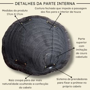 - Fibra orgância premium; - Prótese de tique taque, fácil e prática de utilizar (Sem necessidade de manutenção); - Cabelo com aparência natural; - 4 centímetros de comprimento; - Densidade em 110%; - Produto ligeiramente flexível; - Possui quatro tic-tacs internos para fixação segura; - Dimensões 17x17; - 45g em média.
