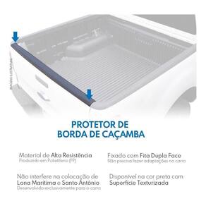 Fabricado em plástico polietileno, protege a borda da caçamba contra pequenas batidas, riscos ou manchas. Produto de fácil instalação pois é fixado com cola dupla face da 3m,basta limpar bem o local onde será fixada a peça, Não impede em nada sua instalação junto com santo antonio ou capota marítima