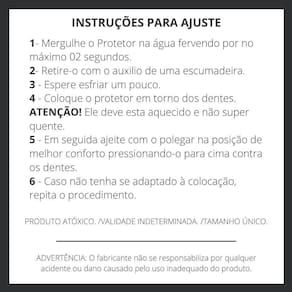 Um protetor bucal básico/ simples moldável para arcada dentaria superior . o protetor bucal deve ser moldado antes do uso. Não deve ser antes da moldagem Desenhado para se encaixar perfeitamente na boca, proporciona proteção para a arcada dentária superior - compacto e resistente. - feito em e.V.A - material não toxico - fácil de moldar - marca spank. Instruções de como moldar acompanha na embalagem Marca: Não Informado Ean: 7908037505662