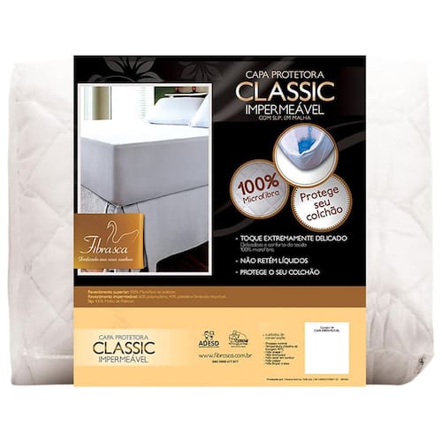 O protetor de colchão Classic é produzido nas nobres malharias da Fibrasca, com alta tecnologia e benefícios para proteger ainda mais o seu colchão Com diferencial de ser o único protetor de colchão com slip tecido lateral que acopla o protetor no colchão contendo elastano, este protetor encaixa perfeitamente em colchões de 20cm até 45 cm de altura sem sobrar tecido, tornando mais fácil o seu incremento. Além disso este protetor de colchão é impermeável em seu revestimento superior, prevenindo a passagem de líquidos para o colchão Seu revestimento é produzido em microfibra com camada de manta de fibra siliconizada, trazendo assim muito mais conforto as suas noites de sono Além disso ele pode ser lavado em máquina, de preferência com o revestimento interno impermeável virado para o lado de dentro, com temperatura até 40ºC Protetor de colchão impermeável é Fibrasca Marca: Não Informado Ean: 7896630397435