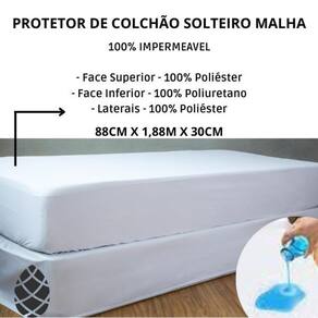 O protetor de colchão de malha solteiro possui ação antimicrobiana contra fungos, ácaros e bactérias. É impermeável e impede a passagem de água, óleos e líquidos para o colchão, mantendo o limpo e com aparência de novo por muito mais tempo.Produzido em malha com tecnologia super impermeável e elásticos para envolver toda a lateral, o protetor de colchão de malha é ideal para quem quer proteger o colchão sem interferir na aparência da cama. Fácil e prático de usar, possui ajuste perfeito ao colchão e pode ser lavado em máquina.