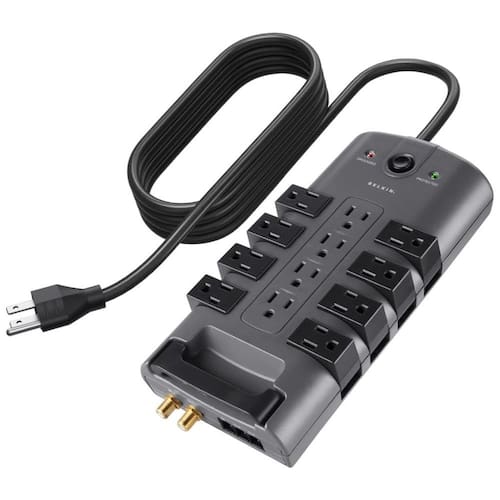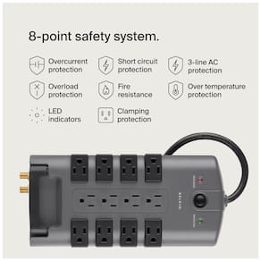 Tira de alimentação multi tomada protetora contra surtos alimente tudo em sua mesa com um único cabo de extensão compacto e protegido contra surtos. Este cabo de alimentação respeitável oferece 12 tomadas CA com proteção contra surtos para carregar seu computador, laptop, telefone, câmera e muito mais. Uma estação de carregamento para uma secretária organizada. Tomada Pivot Compacta com Economia de Espaço Desenvolvida com tomadas rotativas para permitir espaço extra para grandes adaptadores AC e carregadores. O sistema de gerenciamento de cabos mantém os cabos organizados. O design fino com um cabo resistente de 2,4 metros de comprimento o torna ideal para escritórios domésticos, estações de trabalho e salas de jogos. Barra de alimentação com proteção de linha telefônica Com uma proteção de telefone ou fax RJ11 1 in 2 out para garantir conexões de linha telefônica abertas e contínuas. Ele também fornece uma proteção de cabo coaxial para proteger a caixa de cabo e as conexões de satélite. A carcaça resistente a danos protege os circuitos contra fogo, impacto e ferrugem. Confira as especificações completas tensão máxima de pico de 6.000 volts, 15A AC 4 tomadas estacionárias e 8 tomadas rotativas, 125V, 1875W e 150K Hz 100M Hz EMI, RFI Noise Filter. Proteja seus dispositivos e eletrodomésticos O fio elétrico tem uma classificação de energia de 4.320 Watts, fornecendo um cabo de extensão de energia confiável para proteger impressoras, eletrodomésticos e sistemas de home theater. Ele protege seus dispositivos eletrônicos contra sobrecarga, curto circuito, picos de energia, relâmpagos ou flutuações Marca: Não Informado
