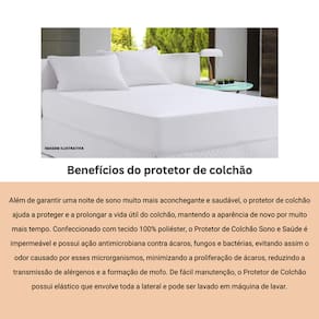 O protetor de colchão Sono e Saúde possui ação antimicrobiana contra fungos, ácaros e bactérias. É impermeável e impede a passagem de água, óleos e líquidos para o colchão, mantendo-o limpo e com aparência de novo por muito mais tempo.
