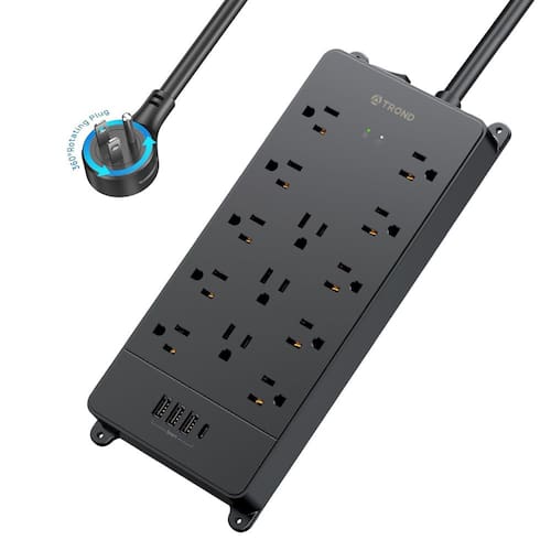 TROND Filtro de linha com filtro de sobretensão, plugue plano rotativo de 360°, expansão de tomadas amplamente espaçadas de 13 AC com porta USB C, 4000 joules, cabo de extensão de 1,5 m resistente, suporte de parede, embaixo da mesa, listado ETL, preto