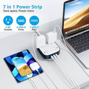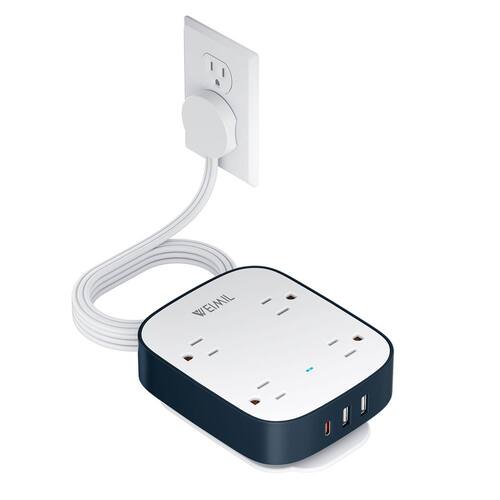 ?Faixa de alimentação de plugue plano?A régua de alimentação de plugue plano WEIMIL com 4 tomadas de proteção contra sobretensão, 2 portas USB-A e 1 porta USB-C, pode carregar até 7 dispositivos simultaneamente. Este divisor de saída com portas USB pode carregar seu cer, laptop, tablet, relógio sem uma variedade de conversores