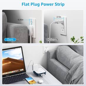 ?Cabo de extensão de saída plana?Régua de alimentação de plugue plano ultrafino de 0,35 polegadas, combinada com um cabo de extensão plano de 5 pés, que pode se esconder perfeitamente atrás do sofá, cama, geladeira e debaixo do tapete. E é fácil passar pela fenda da porta