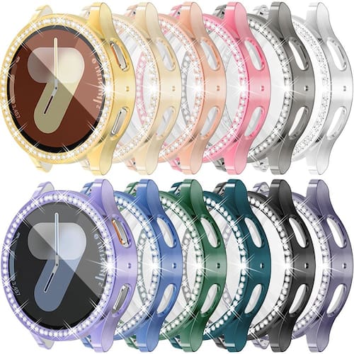 - ?Pacote com 12 e pedra rinestona?A caixa do relógio vem com 12 cores vibrantes. Ouro / ouro pálido / ouro rosa / lilás / rosa / azul / verde / verde esmeralda / cinza névoa / prata / cinza / preto. Conjunto de capas Richone Samsung Watch 7 com um anel de strass brilhante, protegendo seu relógio e adicionando um pouco de interesse estético às suas roupas diárias. Fácil de combinar com várias pulseiras de relógio, combine com seu vestido e capa de telefone, qualquer roupa ou unhas facilmente.