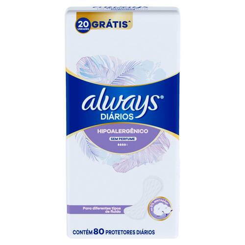Protetor Diário Always Diários Sem Perfume 80 Unidades Always protetores diários, sinta-se limpa e seca todos os dias. São respiráveis e ajudam a proteger sua pele íntima contra irritação.