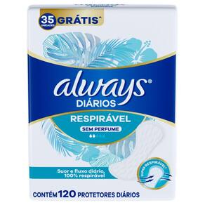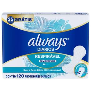 Protetor Diário Always Respirável, 100% respirável para suor e fluxo diário, ideal para uso diário porque permite que a pele respire naturalmente. Com formato anatômico que não incomoda. Sinta-se bem cuidada e fresca todos os dias.