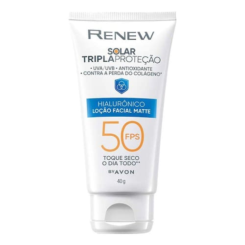 Renew Solar Tripla proteção, protege a sua pele dos raios UVA/UVB, antioxidante e contra a perda de colágeno*. Ajuda a proteger e minimizar os efeitos nocivos do sol agora e no futuro na pele. Muito além de proteção solar. Tripla proteção com efeito matificante por até 12 horas**, que protege e trata cosmeticamente a pele sem pesar. Tripla proteção que não pesa na pele, tem acabamento matte e invisível, não deixa resíduos brancos em nenhum tom de pele. Proteção solar como você nunca viu: Tripla proteção com textura leve que previne o envelhecimento, preenche linhas finas através da hidratação e tem acabamento invisível para todos os tons de pele. Acabamento invisível para todos os tipos de pele, até para as retintas - não deixa resíduos brancos ou acinzentados. Minimiza os efeitos causados pela luz visível e pelos raios infravermelhos. Indicado para pele muito sensível a queimadura solar. O que faz a ação antioxidante? Previne os sinais de envelhecimento causados com o tempo.