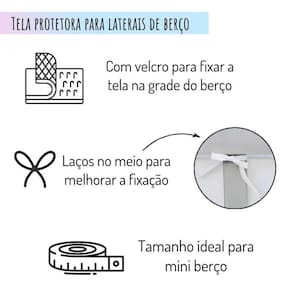 Acompanha: 02 telas laterais para mini berço com 90cm comprimento x 24cm de altura
