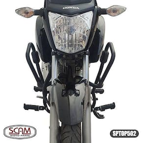 Desenvolvido para absorver os impactos e manter a integridade do chassi em caso de tombos e quedas, o protetor de motor e carenagem Scam reduz a chance de danos mais graves ao motor da motocicleta e suas carenagens nestas situações, proporcionando tranquilidade ao pilotar e manobrar. Com design arrojado este protetor incrementa o visual da motocicleta, conta com o conforto da PEDALEIRA RETRÁTIL removível e é compatível com a fixação de faróis auxiliares.