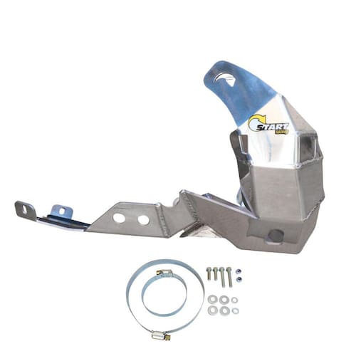 A proteção é fixada cobrindo o bloco do motor e o cano do escapamento da moto para evitar que pedras ou galhos pontiagudos danifiquem ou risquem a motocicleta, protegendo até mesmo estas peças em uma queda durante a prática esportiva.