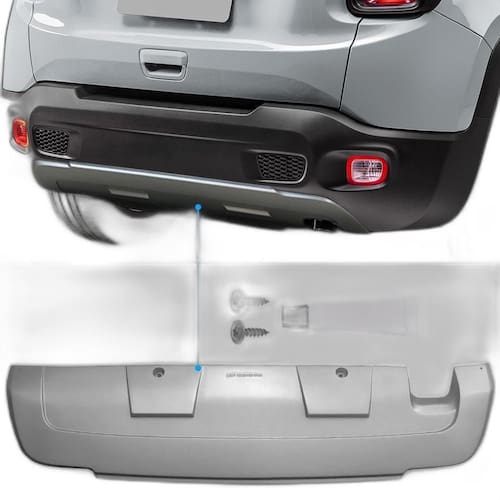 Protetor Para-Choque Traseiro Jeep Renegade 2015 Em Diante Tg Poli Prata DESCRIÇÃO: O Protetor Traseiro é um acessório instalado no para-choque traseiro do seu Jeep Renegade, tendo como objetivo proteger o para-choque de pequenos impactos causados por pedra ou lama, mantendo a integridade do veículo. Além de proteger o veículo, o protetor transmite um visual mais robusto e agressivo sem abrir mão da elegância. Fabricado em Polipropileno PP injetado com pintura na cor prata, é um material leve e resistente ao clima, possuindo uma alta durabilidade e um excelente acabamento.