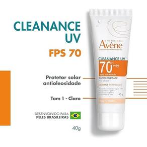 Cleanance UV FPS70 Tom 1 - Claro é um protetor solar de muito alta proteção contra os raios UVB e UVA curtos e longos que possui uma tecnologia oil-block para o cuidado completo que reequilibra a pele e controla a oleosidade de maneira prolongada. Uniformiza o tom da pele, com uma cobertura natural e textura ultra fluida. Com uma combinação exclusiva de ativos no controle da oleosidade: monolaurina, p-refinyl e gluconato de zinco, garante: - 14h antioleosidade e absorção imediata; - Textura fluida e leve; - Diminui a aparência dos poros dilatados; - Mantém a aparência da pele mais uniforme; - Cobertura leve e natural Muito além de um protetor solar, reduz -43% da oleosidade da pele em 28 dias. O aliado perfeito no cuidado da pele oleosa. Disponível em 3 tons desenvolvidos especialmente para peles brasileiras que promovem uma cobertura leve, que uniformiza o tom da pele. Com Água Termal Avène, esse produto é hipoalergênico e não comedogênico e foi formulado de maneira a minimizar o possível surgimento de alergia. Associação exclusiva SUNSITIVE PROTECTION: sistema de filtros patenteados, com fórmula biodragradável que não agride os corais, plânctons e zooplânctons.