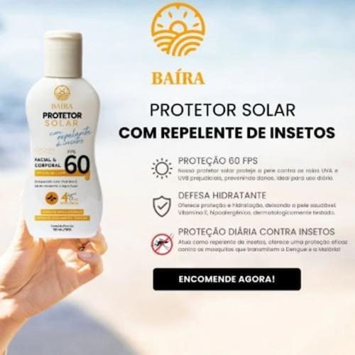 Protetor Solar com Repelente Fps 60 Baíra 120 ml Protetor Solar com Repelente Baíra 120ml Enriquecido com Vitamina E Resistente a água/suor Facial e Corporal Dermatologicamente testado Produto Hipoalergênico Fps 60 O protetor Solar Baíra com repelente de insetos, repele a ação de mosquitos como Aedes Aegypti transmissor da dengue , Anopheles p. transmissor da malária e Culex quinquefaciatus transmissor da filariose . Protege a pele dos efeitos nocivos da radiação UVA e UVB. O protetor Solar Baíra com repelente é indicado para o uso onde há exposição ao ataque de insetos ou radiações ultravioletas. Marca: Não Informado