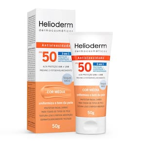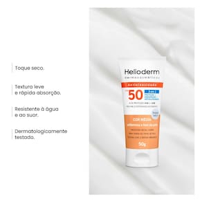Protetor Solar Facial Diário com Cor Antioleosidade Helioderm FPS50 50g O Protetor Facial Helioderm com Cor FPS50 proporciona muita alta proteção UVA e UVB que protege a pele dos efeitos nocivos causa