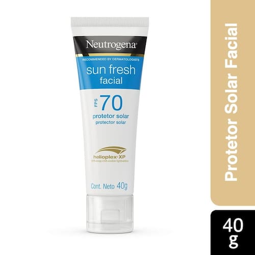 Protetor Solar Facial NEUTROGENA SUN FRESH FPS 70, 40g possui textura ultraleve e hidratante que não derrete e oferece alta proteção contra os raios UVA, UVB e ajuda a proteger contra a luz visível com sua exclusiva tecnologia HELIOPLEX XP. Com ativos ricos em propriedades hidratantes que deixam a pele macia, aveludada e preenchida e complexo antioxidante rejuvenescedor formado por Niacinamida, ativo clareador de sinais causados pelo sol, Feverfew e Vitamina C, poderosos antioxidantes. Melhora a firmeza e elasticidade da pele e possui textura não oleosa. Dermatologicamente testado e adequado para peles sensíveis.