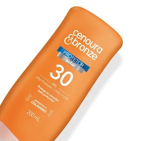 O Protetor Solar Cenoura e Bronze 30 FPS maximiza a proteção na sua pele, criando uma camada contra o sol onde for aplicado. Com tecnologia inovadora, ele também preserva o colágeno natural da pele, minimizando os danos mais profundos. Sua fórmula, resistente à água, contém ativos de Cenoura e Vitaminas E, que previnem o envelhecimento da pele. Produto testado dermatologicamente.