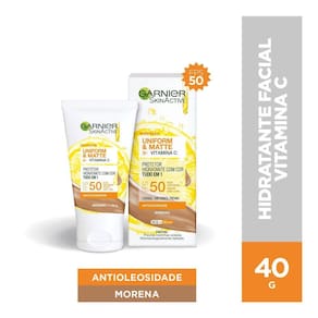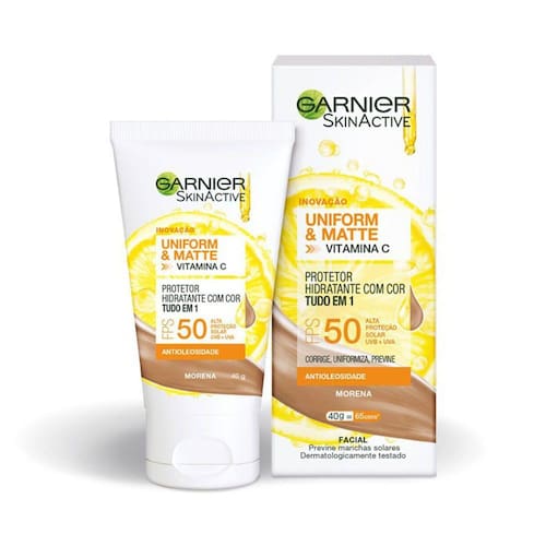 Compre na Drogaria Araujo Protetor Solar Hidratante Garnier Uniform e Matte FPS 50 Cor Morena. Corrige, uniformiza, previne. Formula com Vitamina C, tecnologia Antioleosidade com efeito Matte.