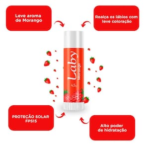 Protetor Solar Labial Laby FPS 15 Sabor Morango 4,5g O que é e para que serve o HIDRATANTE LABIAL LABY MORANGO? O hidratante labial LABY MORANGO proporciona hidratação e proteção para lábios danificad