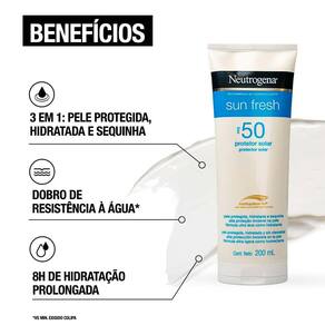 O que é e para que serve? O Protetor Solar Corporal NEUTROGENA SUN FRESH FPS 50, 200mL de textura ultraleve, antioxidante, que deixa a pele hidratada, fresca e sequinha. É de rápida absorção, fácil d