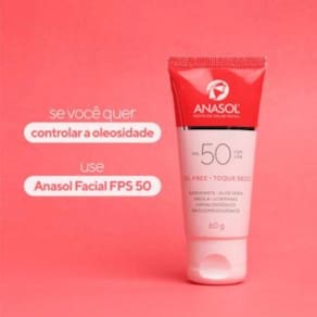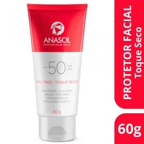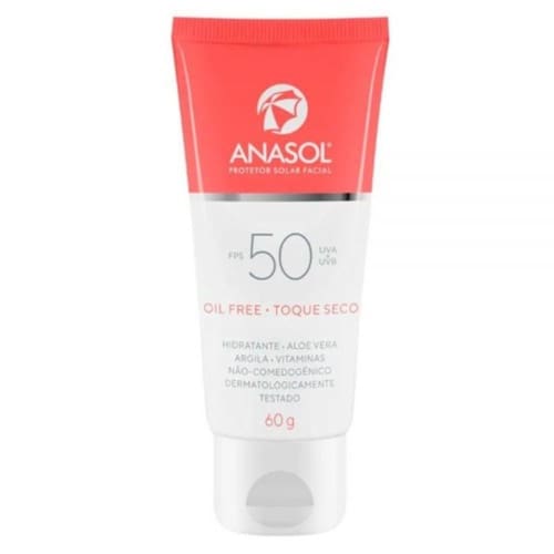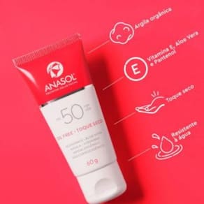 Protetor Solar Facial FPS 50 Anasol - 60mlEfeito Matte prolongado, Oil free e Toque seco. Muito além da excelente Proteção Solar, um Verdadeiro Tratamento para a sua Pele. Quem usa, ama!Produto cruelty free (não testado em animais)! 100% Vegano.O Protetor Solar para área do rosto FPS 50 foi formulado com filtros solares avançados cuidadosamente selecionados para proteger a pele contra a radiação UVA e UVB.Sua fórmula é enriquecida com Aloe Vera, Pró Vitamina B5, Vitamina E e argila orgânica, proporcionando não apenas uma potente ação antioxidante, mas também equilíbrio de oleosidade. Dermatologicamente testado, desenvolvido de maneira a minimizar o possível surgimento de alergias.Uso diário, para todo tipo de pele. Loção Oil free de toque seco, contém argila que reduz a oleosidade da pele. A ação hidratante da Aloe Vera associada à Pró Vitamina B5 e Vitamina E neutralizam os radicais livres. Ajuda a prevenir queimaduras solares causadas por raios UVB, assim como manchas e rugas causadas por raios UVA. Contém proteção UVA equivalente a, no mínimo, 1/3 do FPS declarado (proteção UVB). Aumenta a proteção da pele 50 vezes e é indicado para pele muito sensível a queimaduras solares. Oferece alta proteção contra queimaduras solares. Dermatologicamente testado. Formulado de maneira a minimizar possível surgimento de alergia.Diferenciais do produto:- Contém polímero natural que promove efeito matte e toque seco;- Argila orgânica que auxilia no controle da oleosidade e repõe minerais à pele;- Argila orgânica que auxilia no controle da oleosidade e repõe minerais à pele;- Resistente à água, dermatologicamente testado, não comedogênico e oil free.Modo de usar:Agite antes de usar. Aplique abundantemente antes da exposição ao sol. Resistente à água: mantém a proteção solar por 40 minutos dentro da água. Reaplicar sempre, após sudorese intensa, nadar ou banhar-se, secar-se com toalha e durante a exposição ao sol. É necessária a reaplicação do produto para manter sua efetividade. Se a quantidade aplicada não for adequada, o nível de proteção será significativamente reduzido.