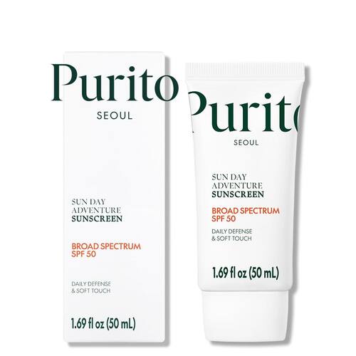 PURITO Protetor solar Sun Day Adventure de amplo espectro FPS 50, proteção UVA e UVB, sem gesso branco, leve e sem óleo para todos os tipos de pele, vegano, diário, coreano, cuidados com a pele 50 ml, 1,69 ml