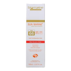 O Biomarine Sun Marine FPS 66 é um protetor solar de alta proteção desenvolvido para uso diário, com fórmula que combina filtros UVA e UVB e ativos antioxidantes e hidratantes. Sua textura leve e de rápida absorção proporciona toque seco e sensação de conforto, mantendo a pele protegida e com aspecto saudável.Benefícios e característicasAlta proteção contra os raios UVA e UVB, ação antioxidante, sensação de hidratação prolongada, textura confortável e rápida absorção, indicado para todos os tipos de pele.Ativos principaisMelitane, Caviar, Lanablue, Ácido Hialurônico, Resveratrol e OTZ.Modo de usoAplicar diariamente sobre a pele limpa e seca, espalhando de maneira uniforme até completa absorção. Reaplicar a cada duas horas ou sempre que necessário, principalmente após transpiração, contato com água ou fricção da pele.