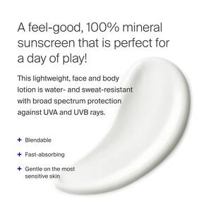 - O que a torna super: esta loção mineral leve oferece 80 minutos de proteção UV resistente à água e ao suor — ideal para um dia de diversão. A fórmula de óxido de zinco não nano possui ingredientes que nutrem suavemente a pele da cabeça aos pés.