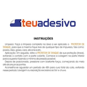 Limpeza: Primeiro faça uma limpeza completa na área a ser aplicado o adesivo, para que a mesma fique livre de qualquer tipo de impureza, tais como: poeira, óleo, graxa, cera, silicone e etc. Em seguida, retire o Protetor de Tanque de sua proteção (Liner) evitando o contato com a parte colante. MUITA ATENÇÃO na colocação, pois após a aplicação, se retirado perde parte de sua aderência e não é recomendado a reaplicação. Comece a colagem da parte inferior para a superior fazendo o mínimo de pressão possível. Depois de posicionado, pressione com bastante força, começando do meio até alcançar as pontas.