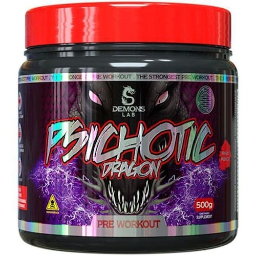Psichotic Dragon Pre Treino - Demons Labs (500g) Sabor: Fruit Punch DESCRIÇÃO: É um Pré-treino completo, super concentrado, com ingredientes clinicamente testados, que oferecem energia de forma Explosiva, auxiliam na melhora do desempenho nos treinos intensos, promovendo o aumento de força, resistência e Recuperação muscular. Sua formulação contém nutrientes importantes para o bom funcionamento do organismo e Especialmente selecionados para potencializar os treinos, proporcionando suporte neural, além de promover o aumento Da massa magra, permitindo máximo desempenho nos treinos, melhorando com isso seus resultados e ajudando a superar Seus limites. Além disso sua fórmula abrangente de aminoácidos ajudam a otimizar o anabolismo muscular, aumentar a Capacidade de resistência, combater as dores e a fadiga muscular e aumentar os níveis de óxido nítrico e a vasodilatação. PSYCHOT DRAGONS da Demons Lab é um precursor de neurotransmissor precisamente dosado e combinado com uma quantidade Potente de cafeína que vai te dar energia para passar pelas sessões de treinamento mais difíceis e melhorar sua Concentração.