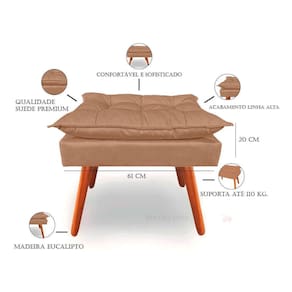 - altura: 52 cm; - largura: 46 cm; - profundidade: 62 cm. O que você está adquirindo: 01 unid. Puff opala com pés de madeira envernizado