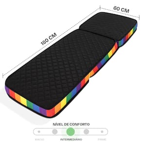 Características: 3 formas de uso: puff, sofá ou colchonete. Medida fechado: 60cm X 60cm X 30cm (Largura X Profundidade X Altura). Medida aberta: 60cm X 180cm X 10cm (Largura X Profundidade X Altura). Densidade: Espuma D33 selada e certificada. Enchimento e Composição: Espuma de Poliuretano e 100% polipropileno, materiais que conferem durabilidade e conforto. Tecido: Poliéster de alta qualidade com bordado em matelassê. Marca: BF Colchões.