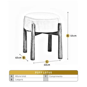 • Verificar dimensões para acesso ao local de uso Ambiente Principal: Sala de Estar Cor: Preto Cor do Produto: Preto Escala de Brilho: Fosco Itens Inclusos: 1 Puff Linha ou Coleção: Lotus Material da Estrutura: Madeira Eucalipto Material dos Pés: Madeira Maciça Necessita Montagem: Não Peso: 6 kg Possui Baú: Não Possui Pés: 04 Possui Rodízio: Não Recomendações de Uso, Manutenção e Limpeza: Utilizar um pano levemente umedecido, seguido de pano seco.Evitar exposição ao sol, para que não sofra alterações na cor do tecido.Não limpar com escovas ou semelhantes. Suporta Até (kg): 120 kg