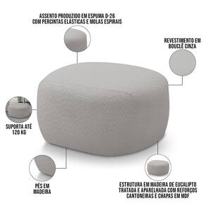 Altura: 42 | ColorFamily: Cinza | Material: Estrutura em madeira de eucalipto tratada. | MaterialFamily: Madeira | OriginState: PR | SizeDescription: Altura: 42 cm x Largura: 67 cm x Profundidade: 63 cm | Depth Front To Back: 63 | ColorSimple: Cinza | OriginCountry: | SupplierSimpleName: Puff Decorativo Orgânico Para Sala de Estar Living Barolo L06 Bouclê Cinza - Lyam Decor | ProductWeight: 35 kg | Largura: 67 | ColorSupplier: Cinza | Model: Barolo | Lado a Lado: 63 | Color: Cinza | ProductWidth: 67 cm | ProductHeight: 42 cm | DepthWidthSideToSide: 63 | ProductLength: 63 cm | ProductWarranty: 90 dias após o do produto | ProductContents: 01 Puff | ProductInstructions: Produto para uso em ambiente interno, nao devendo ficar exposto ao sol, calor e umidade excessivos. | Profundidade: 63 | Cor: Cinza