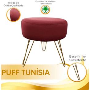 O Puff Tunisia e um movel versatil e confortavel, fabricado na Tunisia. Possui design elegante, materiais duraveis e pode ser utilizado como assento adicional ou apoio para os pes. E leve, compacto e combina com diferentes estilos de decoracao. E uma opcao funcional e estilosa para adicionar conforto aos ambientes.