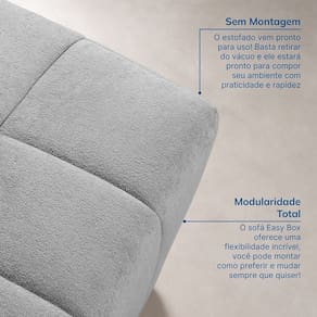 O sofá modular compactado torna o processo de compra de sofás uma experiência descomplicada e surpreendente, através das muitas possibilidades de design em um único sofá, apresenta um tecido selecionado por especialistas: um boucle sofisticado com alta resistência a arranhões de gatos, tornando-o pet friendly. Além disso, é de fácil limpeza e traz alta durabilidade. Na parte inferior possui fecho de contato, garantindo a união dos módulos do sofá. Com essa conexão rápida, você pode montar o sofá modular como quiser e ter a certeza de que os módulos permanecerão firmemente conectados. Ambiente Principal: Sala de Estar Cor: Cinza Claro Cor do Produto: Cinza Claro Escala de Brilho: Fosco Itens Inclusos: 1 Puff para Sala Linha ou Coleção: Easybox Manual de Montagem e Instalação: https://product-hub-prd.madeiramadeira.com.br/966366/documents/b353a805-a330-4ec6-ad6f-9a03e32ef3ad2512598342817302204332037.pdf Marca: CabeCasa MadeiraMadeira Material da Estrutura: Polipropileno Necessita Montagem: Não Origem do Produto: Nacional Peso: 9,85 kg Possui Baú: Não Possui Pés: Não Recomendações de Uso, Manutenção e Limpeza: Para a limpeza diária do seu sofá, utilize o aspirador para manter o sofá impecável, para manchas, água e sabão neutro. Em caso de serviço contratado para a limpeza, recomendamos profissional para limpeza mais intensa. Considere a impermeabilização para proteção extra. Suporta Até (kg): 100 kg
