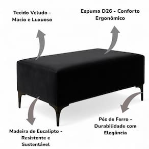 • Design: Com acabamento em Veludo Preto, o puff Madri oferece um toque elegante. A cor Preto combina perfeitamente com diversos estilos de decoração.