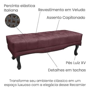 O Puff Recamier Vicenza de 160cm é uma peça de mobiliário elegante e funcional, projetada para adicionar um toque de sofisticação e conforto ao seu ambiente. Sua estrutura é construída com madeira de eucalipto reflorestada mdf, garantindo durabilidade e sustentabilidade ambiental. Os pés são feitos de madeira maciça no estilo Luís XV, proporcionando estabilidade e robustez à peça. A densidade da espuma, classificada como D26, assegura um suporte confortável para o usuário, ideal para momentos de relaxamento e descanso. O tecido em Veludo confere um acabamento suave e luxuoso, adicionando um toque de requinte ao design. Contém detalhes refinados como as tachinhas em metal fumê na borda, no assento contém detalhes em capitonê onde o estofamento é marcado com fios grossos, costurados ao tecido, formando saliências geométricas, enquanto a presença de percinta elástica italiana assegura suporte adicional e durabilidade. Com uma capacidade de suportar até 120 kg, o Puff Recamier oferece conforto e segurança para diferentes usuários. Quanto ao uso, o Puff Recamier pode ser utilizado em diversos ambientes, desde o quarto como um elegante banco no pé da cama, até a sala de estar como um sofá auxiliar ou até mesmo em espaços comerciais, como recepções ou salas de espera, adicionando conforto e estilo onde quer que esteja. Seja como um elemento decorativo ou como um lugar para relaxar, este móvel é uma escolha versátil e elegante para qualquer ambiente.