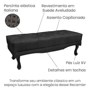 O Puff Recamier Vicenza de 195cm é uma peça de mobiliário elegante e funcional, projetada para adicionar um toque de sofisticação e conforto ao seu ambiente. Sua estrutura é construída com madeira de eucalipto reflorestada mdf, garantindo durabilidade e sustentabilidade ambiental. Os pés são feitos de madeira maciça no estilo Luís XV, proporcionando estabilidade e robustez à peça. A densidade da espuma, classificada como D26, assegura um suporte confortável para o usuário, ideal para momentos de relaxamento e descanso. O tecido em Suede confere um acabamento suave e luxuoso, adicionando um toque de requinte ao design. Contém detalhes refinados como as tachinhas em metal fumê na borda, no assento contém detalhes em capitonê onde o estofamento é marcado com fios grossos, costurados ao tecido, formando saliências geométricas, enquanto a presença de percinta elástica italiana assegura suporte adicional e durabilidade. Com uma capacidade de suportar até 120 kg, o Puff Recamier oferece conforto e segurança para diferentes usuários. Quanto ao uso, o Puff Recamier pode ser utilizado em diversos ambientes, desde o quarto como um elegante banco no pé da cama, até a sala de estar como um sofá auxiliar ou até mesmo em espaços comerciais, como recepções ou salas de espera, adicionando conforto e estilo onde quer que esteja. Seja como um elemento decorativo ou como um lugar para relaxar, este móvel é uma escolha versátil e elegante para qualquer ambiente.
