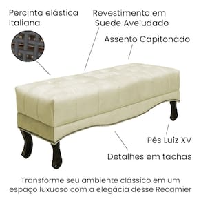 O Puff Recamier Retrô Vic foi desenvolvido para quem busca funcionalidade e elegância. Com 90cm de largura, ele é perfeito para complementar a decoração do quarto, sala ou hall de entrada, garantindo um toque de charme ao ambiente. Confeccionado em suede aveludado, proporciona um toque macio e aconchegante. O assento capitonado é preenchido com espuma D26, garantindo firmeza e durabilidade sem abrir mão do conforto. Os pés de madeira maciça estilo Luís XV oferecem um toque vintage e robustez ao móvel. Com detalhes impecáveis, como as tachinhas em metal fumê e a costura em matelassê, que reforçam a sofisticação do design e agregam personalidade e requinte à peça. Este móvel chegará em sua casa separado em 01 volume.