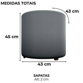 Baterias são necessárias?: Não | Certificação de teste externa: Não se aplica | Componentes incluídos: Parafusos | Exige montagem: Sim | Fabricante: Matrix | Is Fragile: Não | Número da peça: Não se aplica | Número do modelo: Copenhage | Palavras-chave de Pesquisa: Puff Redondo | Peso do item: 8 | bullet_point 0: Sapatas niveladoras | bullet_point 1: Revestido em Veludo | bullet_point 2: Madeira de Eucalipto | Quantidade de itens: 1 | item_dimensions: Altura: 45 cm Largura: 43 cm Profundidade: 43 cm | Marca: Matrix | Forma: Redondo Cor: Cinza