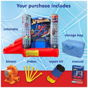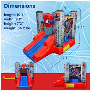 Aproveite uma aventura emocionante com o Homem Aranha oficialmente licenciado pela Marvel. Este pula pula infantil apresenta uma linda arte de alta qualidade, que estimula a imaginação das crianças. Com inúmeros recursos infláveis, incluindo área de salto, subida e descida e cesta de basquete, este brinquedo proporciona horas de diversão em família. Além disso, é uma ótima fonte de exercício físico para as crianças. Com um kit de reparo inflável e um prático soprador inflável para instalação rápida, este brinquedo pode ser inflado e desinflado em menos de um minuto. Transporte e guarde o em sua própria bolsa inflável e maleta de transporte.